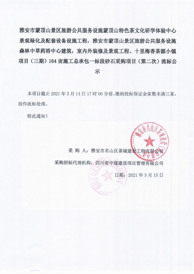 雅安市蒙頂山景區旅游公共服務設施蒙頂山特色茶文化研學體驗中心景觀綠化及配套設備設施工程,雅安市蒙頂山景區旅游公共服務設施森林中草藥浴中心建筑,室內外裝修及景觀工程、十里梅香茶源小鎮項目(三期)164畝施工總承包一標段砂石采購項目(第二次)流標公示